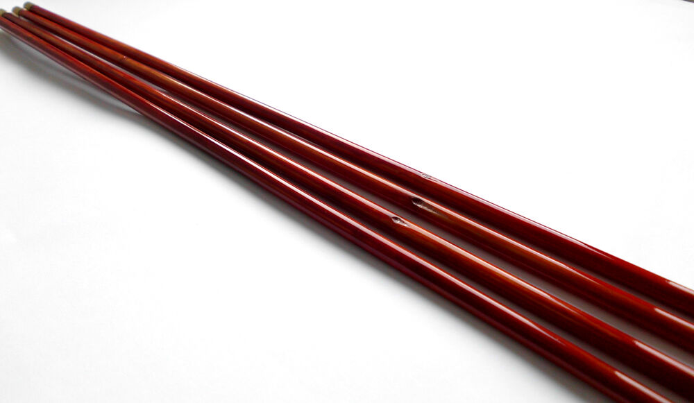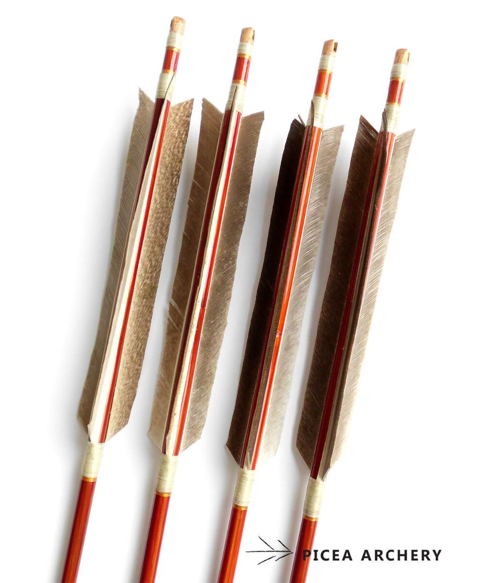 Strzały z bambusa Pseudosasa Japonica, lakierowane na czerwono. Lotki z naturalnych piór - najczęściej indyczych, imitujących kolorystyką ptaki łowne
