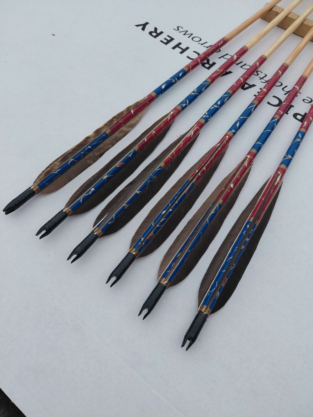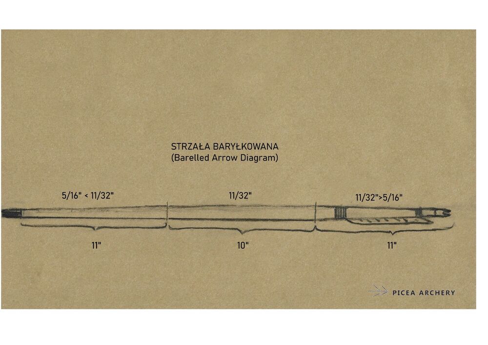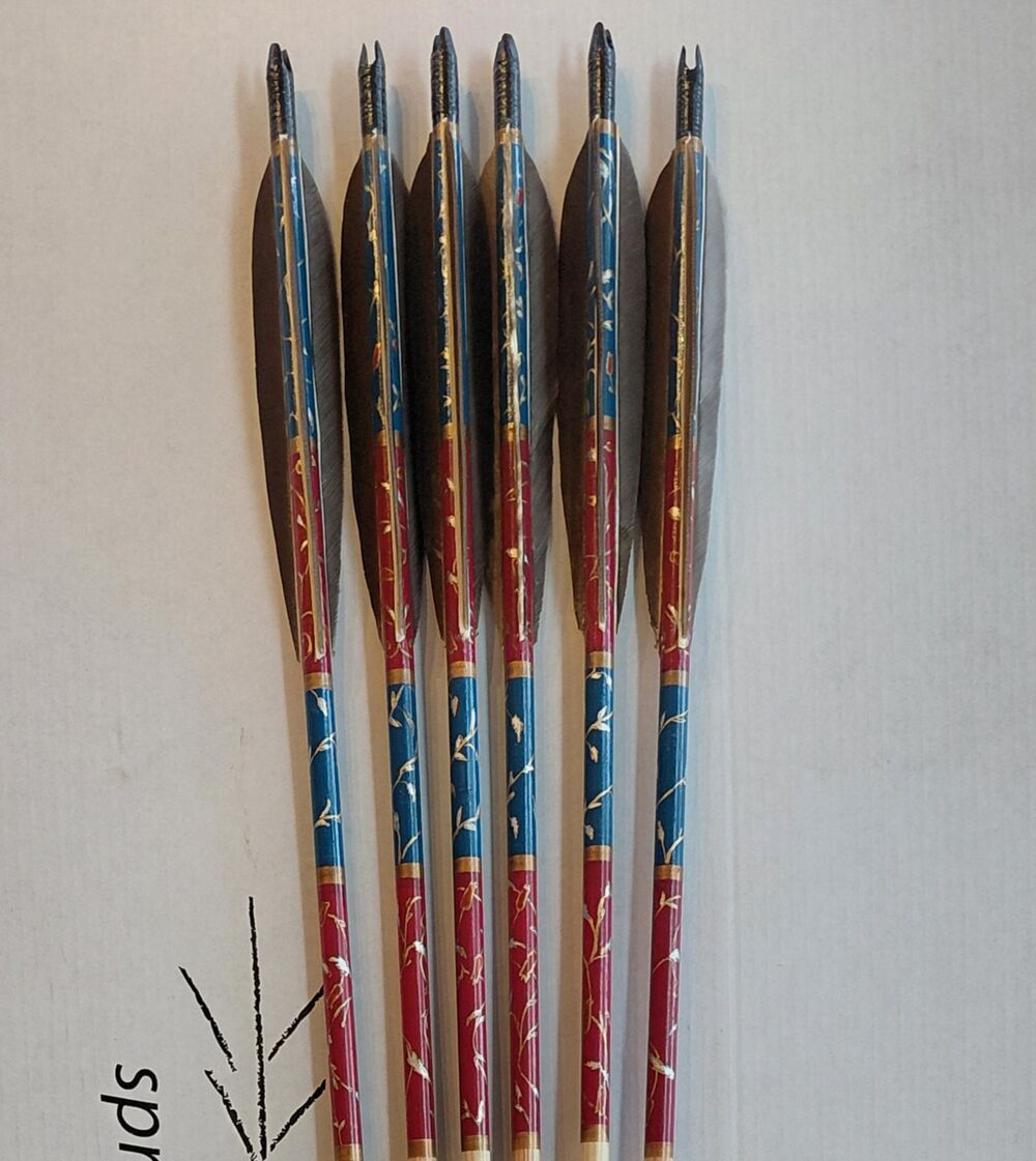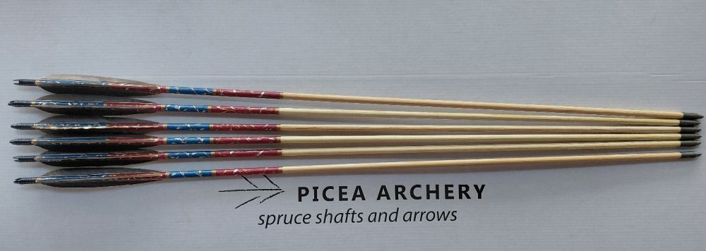 Lotki: 6" lotki indycze naturalne, przycięte w tylnej części i przesunięte lekko ku przodowi zamiast klejenia bezpośrednio przy osadzie strzały, co daje uniwersalną możliwość strzelania z palców zamiast jedynie za pomocą zekiera.